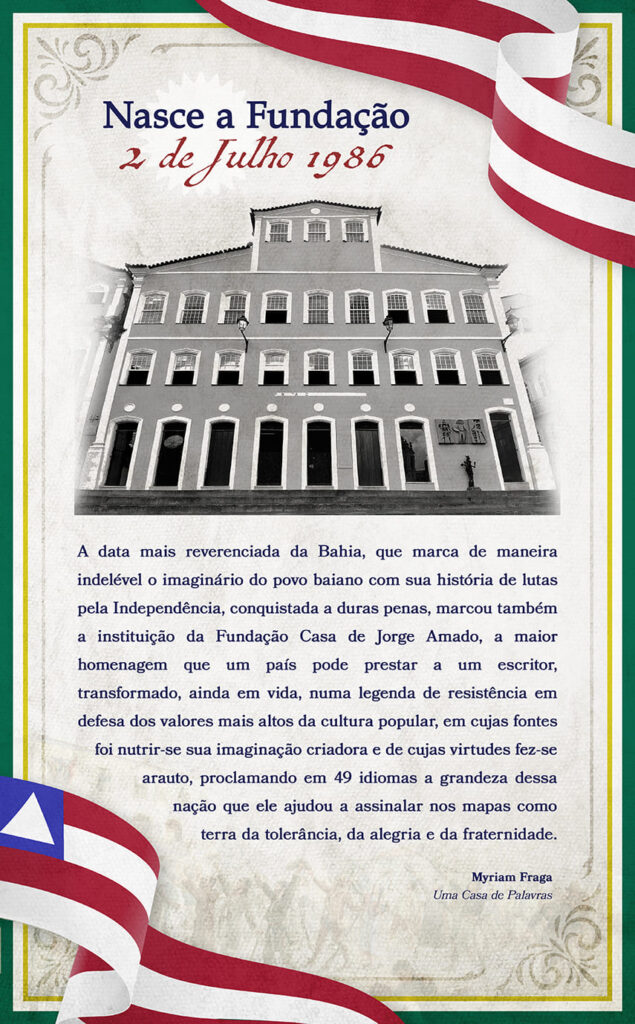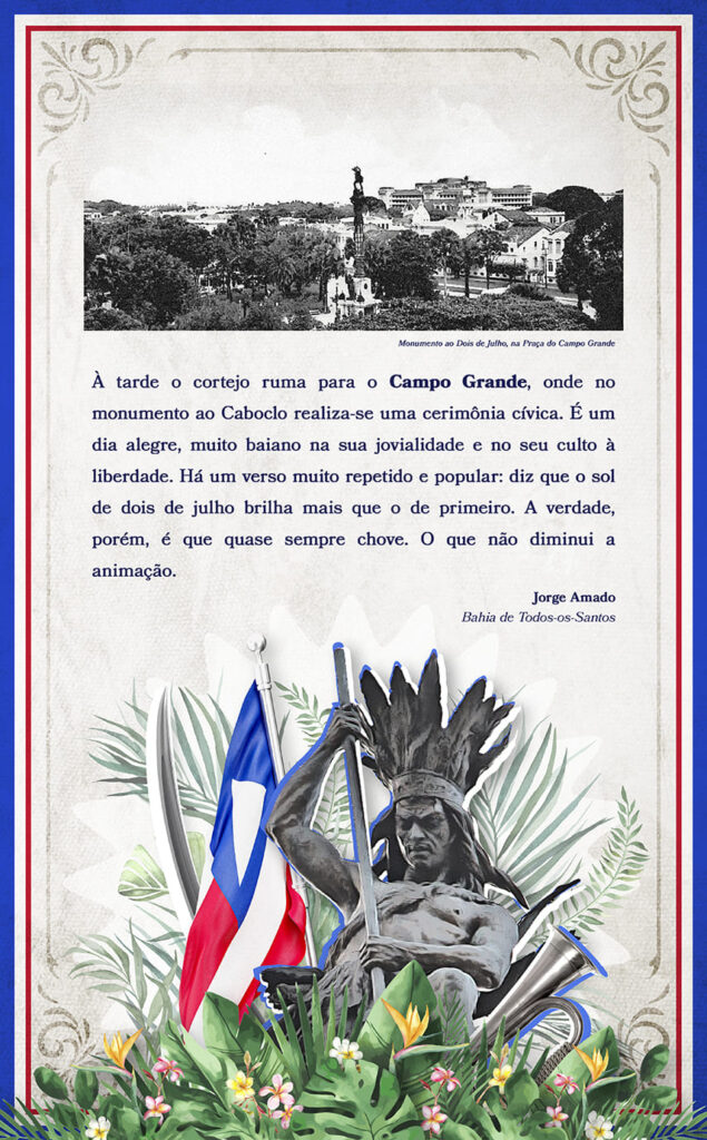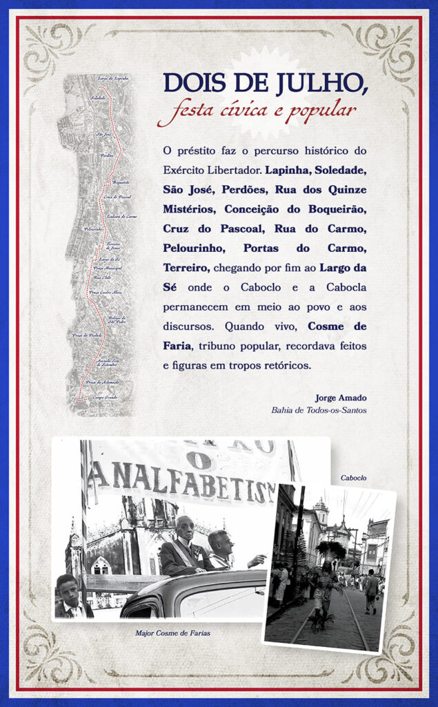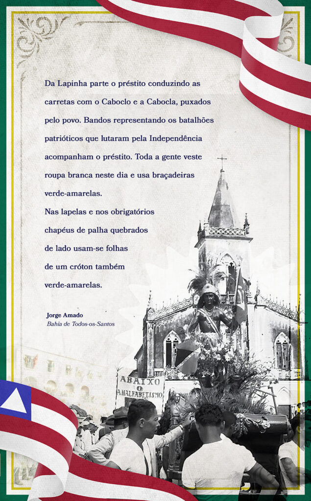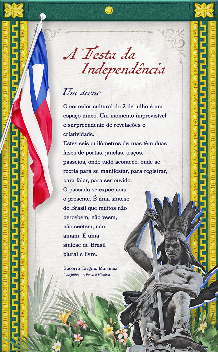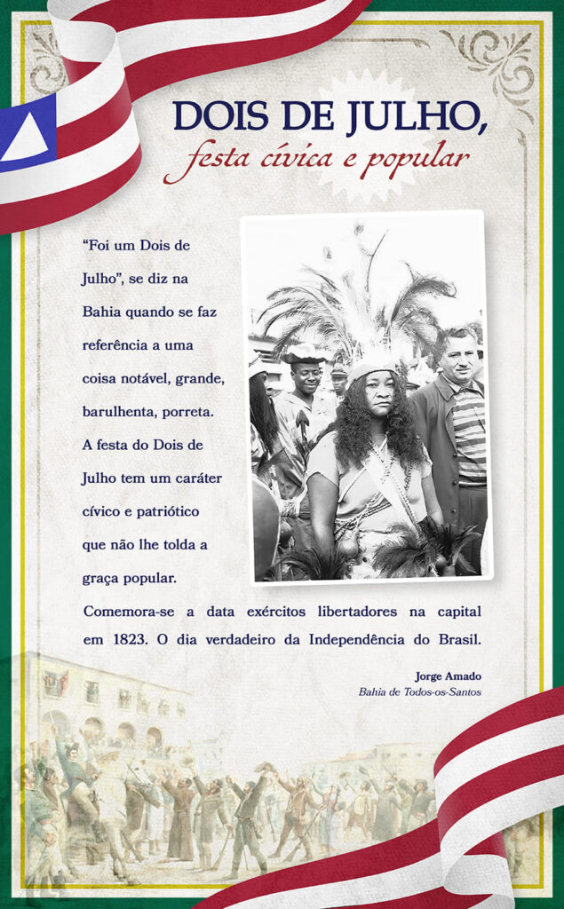 Nesta pequena mostra trazemos algumas referências emblemáticas e curiosas em torno da Data Magna do nosso Estado.  Textos e fotografias que registram a importância do nosso marco e da forte participação popular na festa que reflete a bravura, a esperança e orgulho do povo baiano.